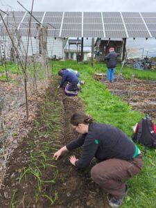 Planting onions seedlings under bean trellis SMALLER