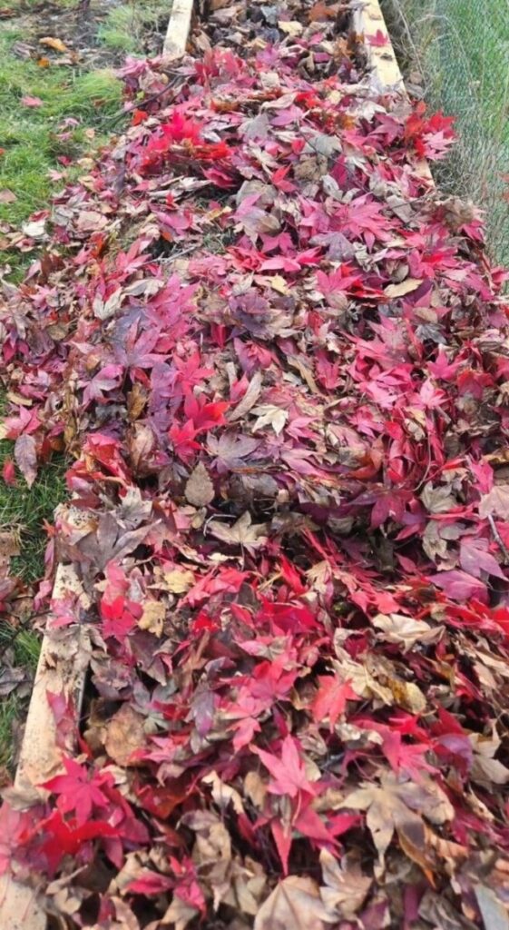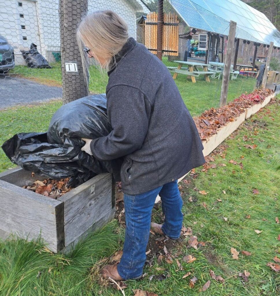 A gardener fills new beds with earth from dismantled boxes. The bagged leaves dropped off here by the wonderful City of Montpelier’s Public Works Department glow bright, giving us peak fall color all over again.