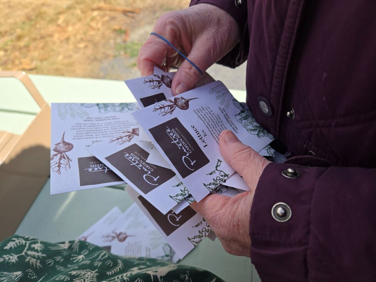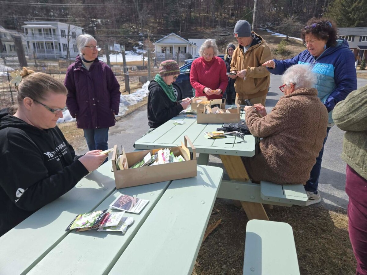 Gardeners sort seeds: planting here this season, saving for next season, and giving to neighbors and other community gardens.